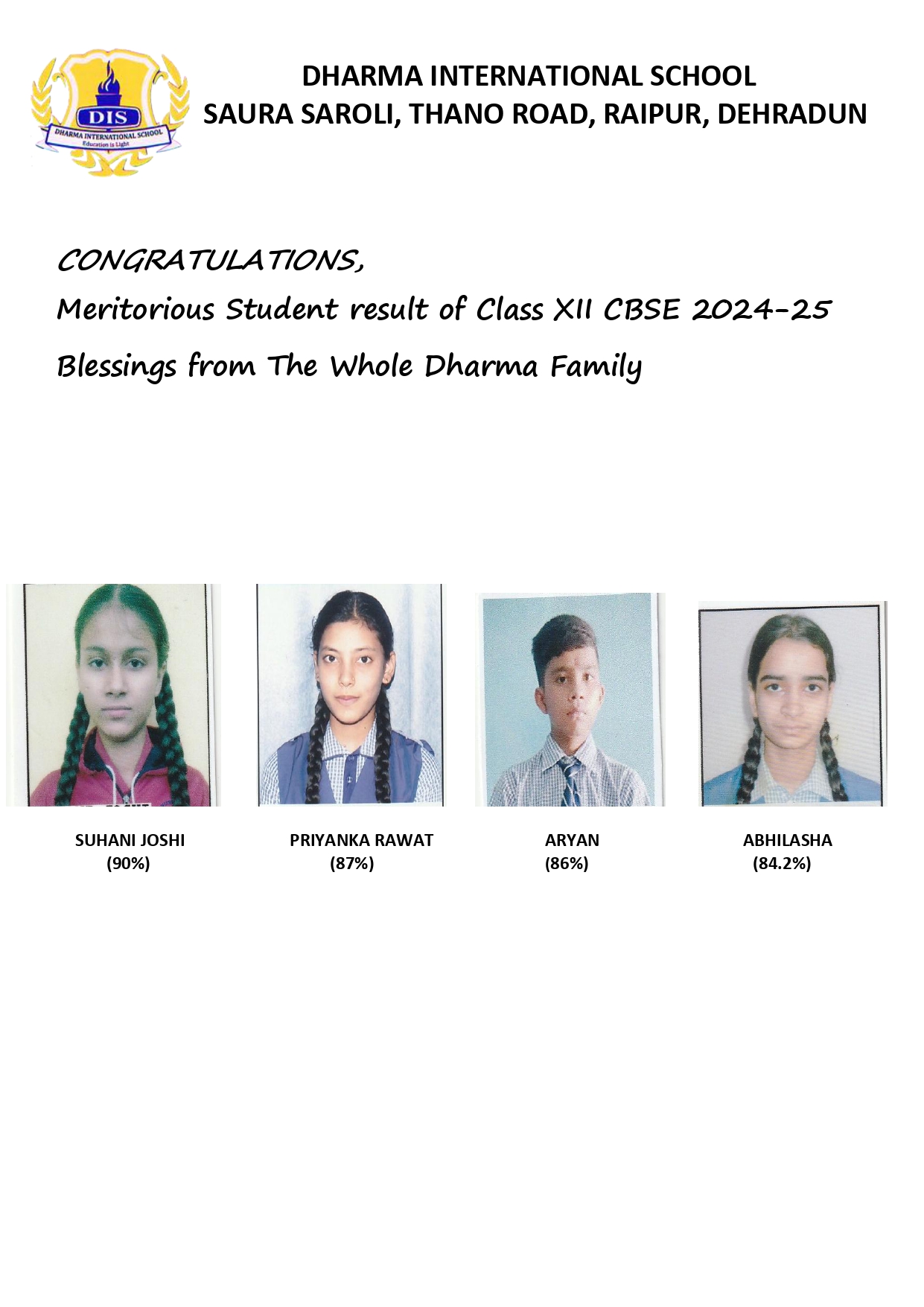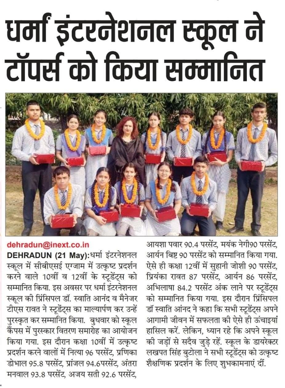 Congratulations to all the toppers and all other students for their Wonderful and Meritorious performance in Class XII CBSE Board Exams 2024-2025. Your Performance is a celebration to all Dharma International Senior Secondary School, Raipur Dehradun family, in showing the horizon of performance for future generations.